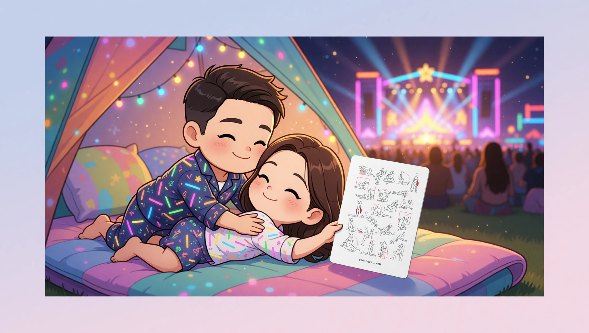 Zip the tent shut. Place a mat on the floor. She lies on her back and bends her knees. You kneel between her legs. Enter her and move in short strokes in time with the music outside.