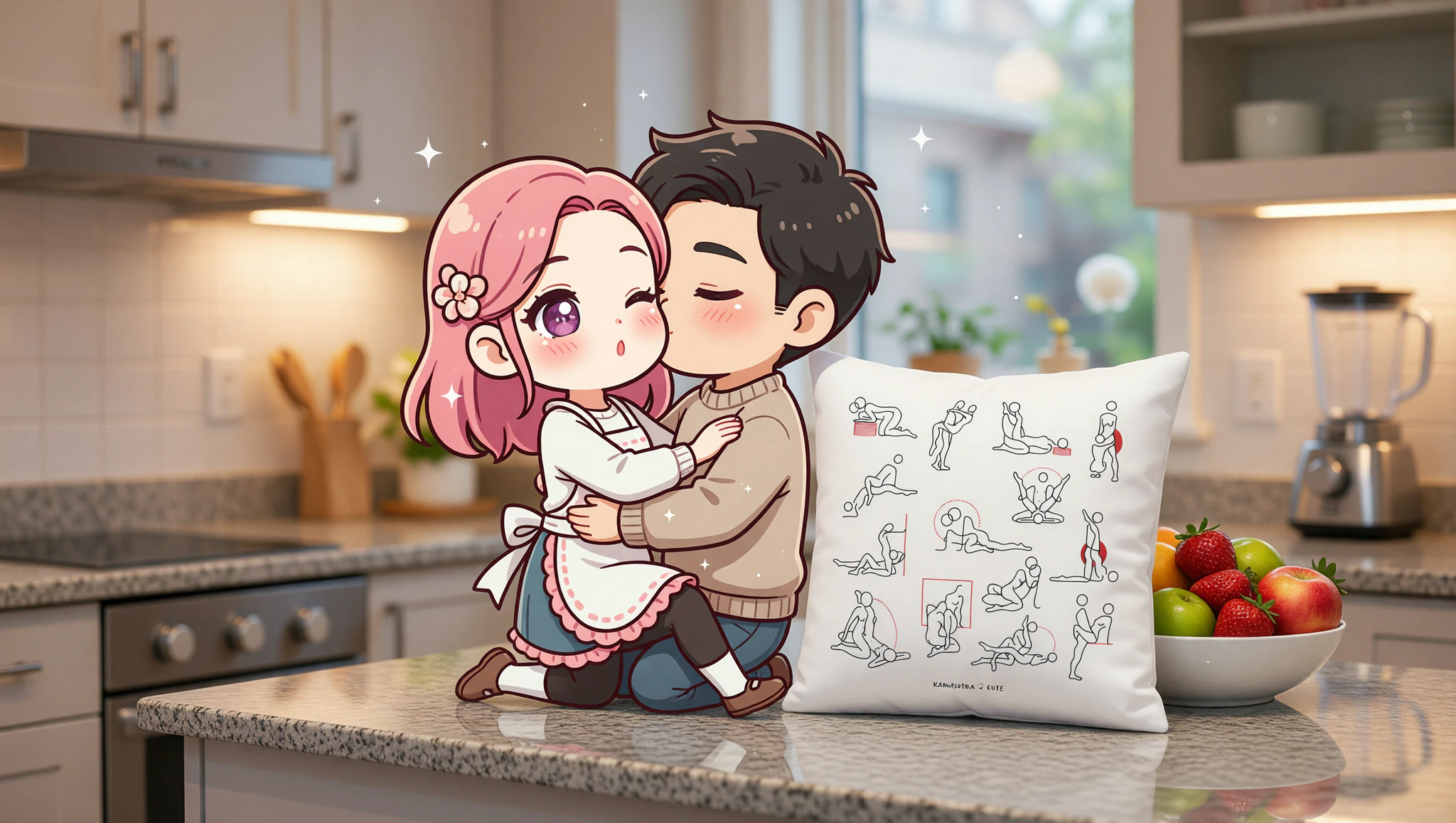 Ella se sienta en el borde de la encimera con piernas abiertas. Él se para frente a ella, entra suavemente guiando sus caderas. Mantén contacto visual para intensificar la conexión.
