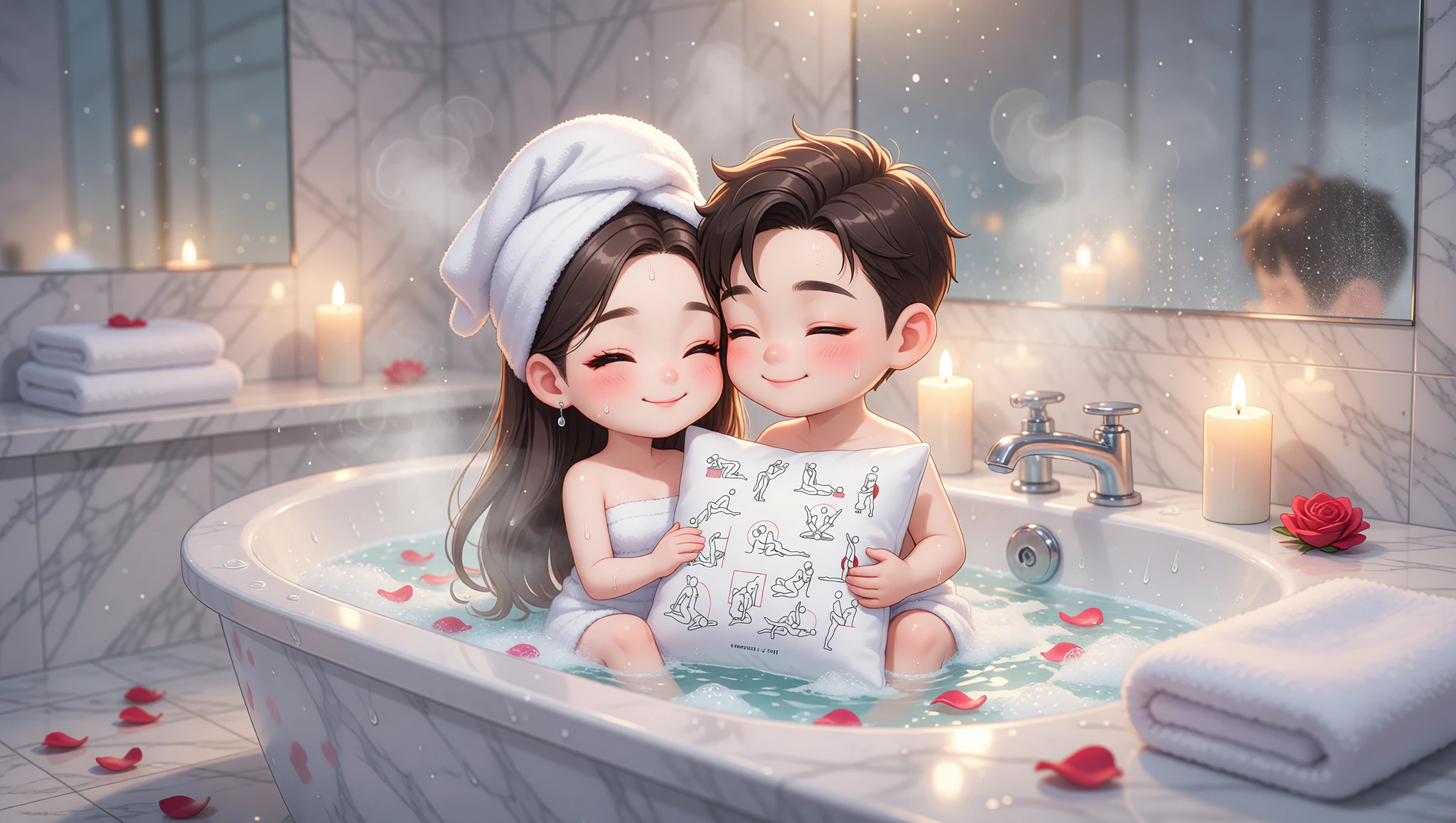 She lies on her side in the tub, knees drawn up. He spoons behind, entering slowly while water laps around you. Hands roam freely over wet skin for a full-body caress. Rock gently to build rhythm amid bubbles.