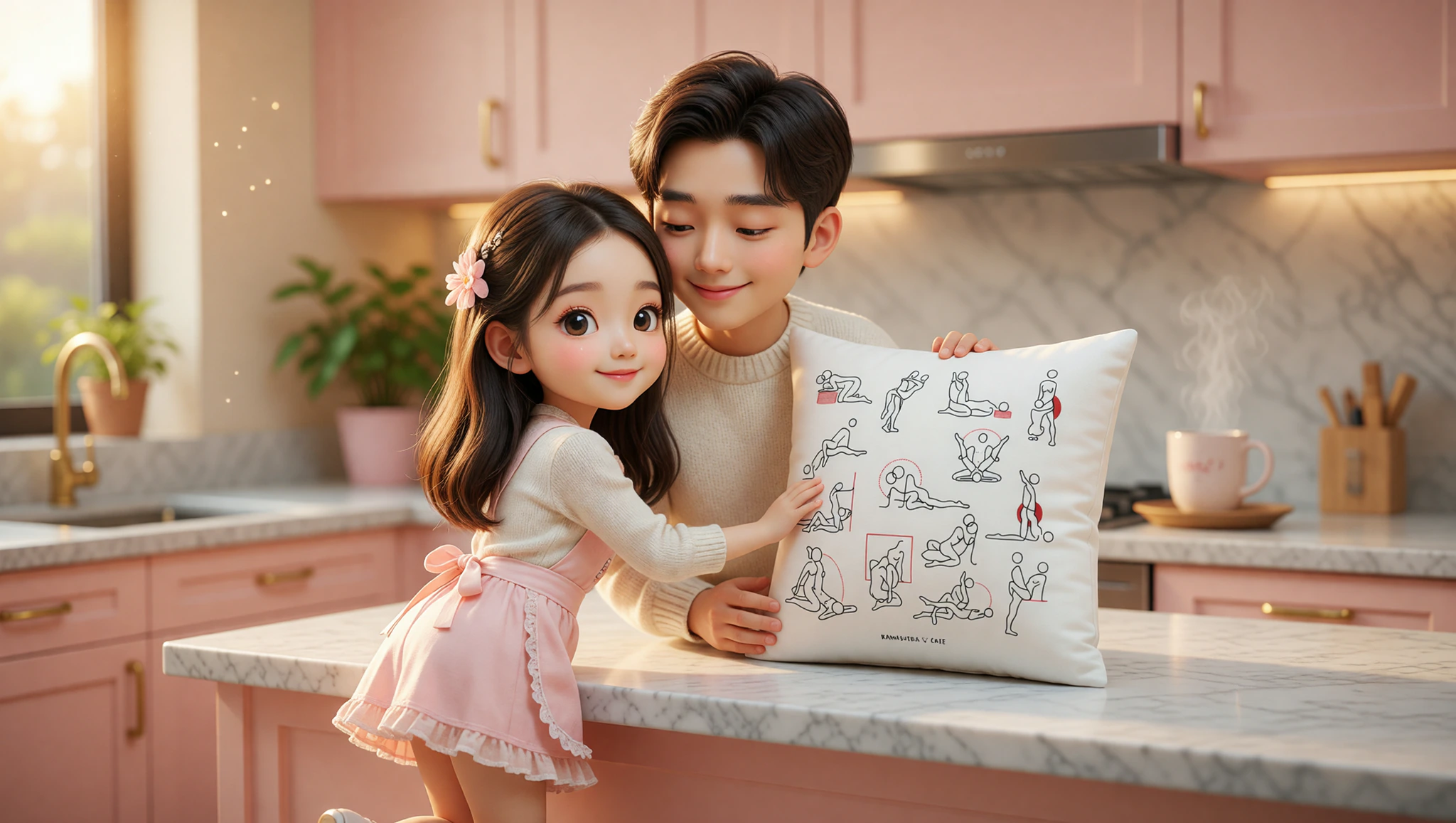 She faces the counter and bends at the waist, hands flat on surface for support. He stands behind her legs, grips her hips, and enters from rear. Rock together in steady rhythm. Adjust her stance wider for deeper access.