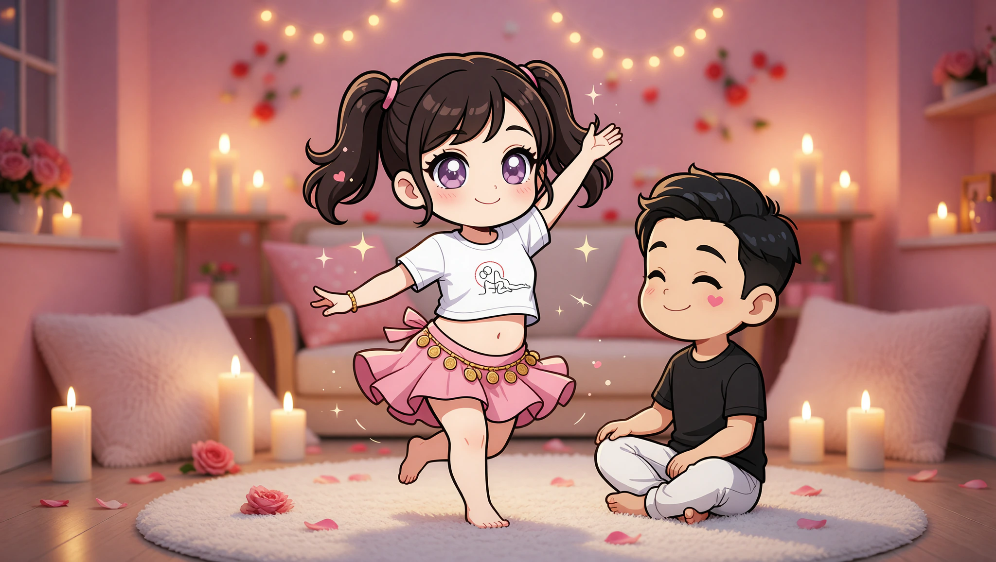 Push furniture to walls for dance floor. Use phone flashlight for soft glow. Pull up free YouTube bellydance tutorials. Lay down a yoga mat to cushion spins.