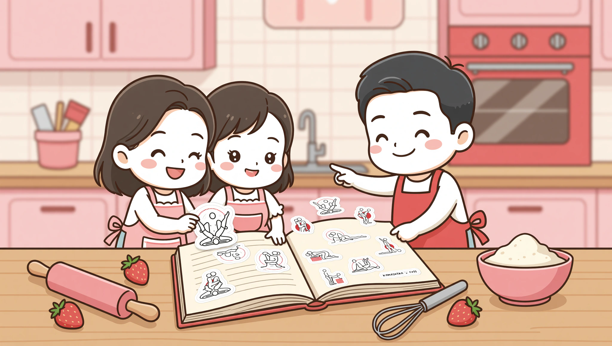 He blindfolds her gently, then together they mix cookie dough wearing only aprons for safety. Stir flour, sugar, and chocolate chips slowly, savoring each texture against bare skin. Bake at 350 degrees for 12 minutes. Cool on racks while sharing laughs. Finish by peeling Kamasutra Cute stickers onto your recipe journal page to mark this sweet memory.