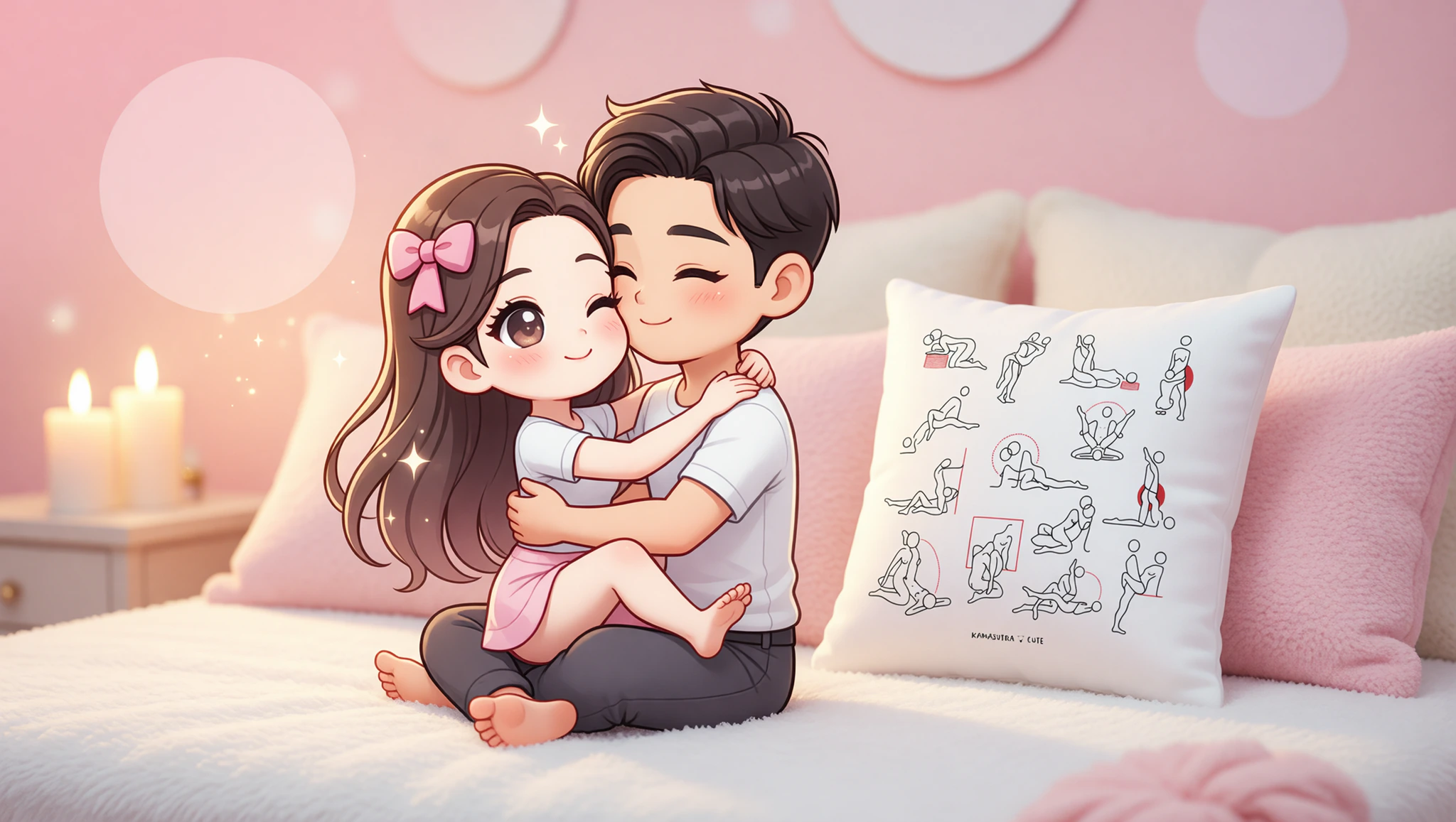 Sit facing each other on the bed. He crosses his legs. She straddles his lap, wrapping her legs around his waist and arms around his neck. Lean back slightly. Rock hips in slow circles, maintaining eye contact for profound connection. Breathe in sync to heighten unity.