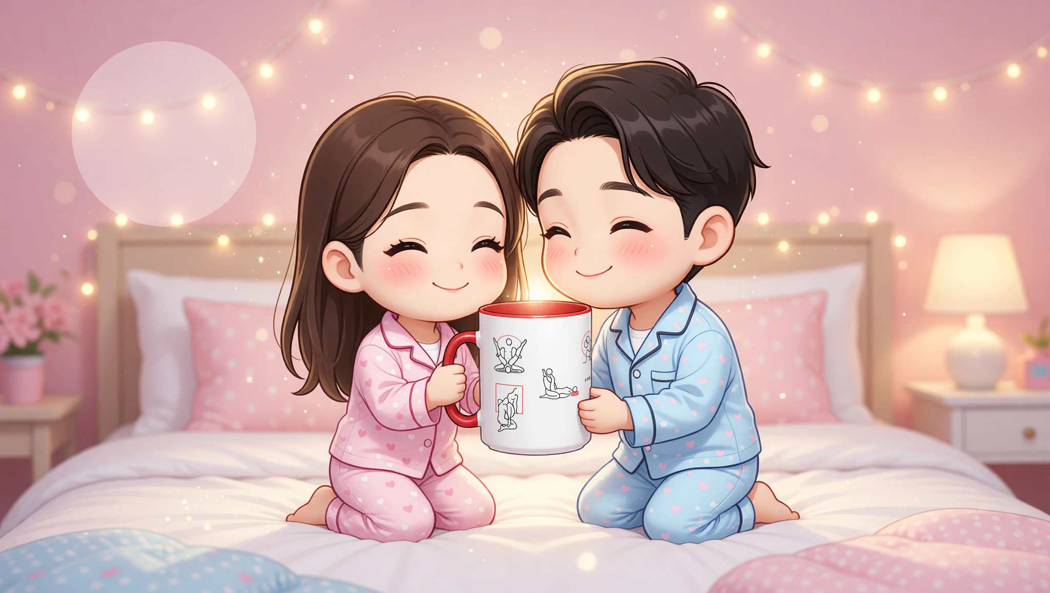 Set mood first with warm tea in the Kamasutra Cute - Mug with Color Inside. Watch color reveal inside to start flirty position talk. Eye contact here fosters trust.