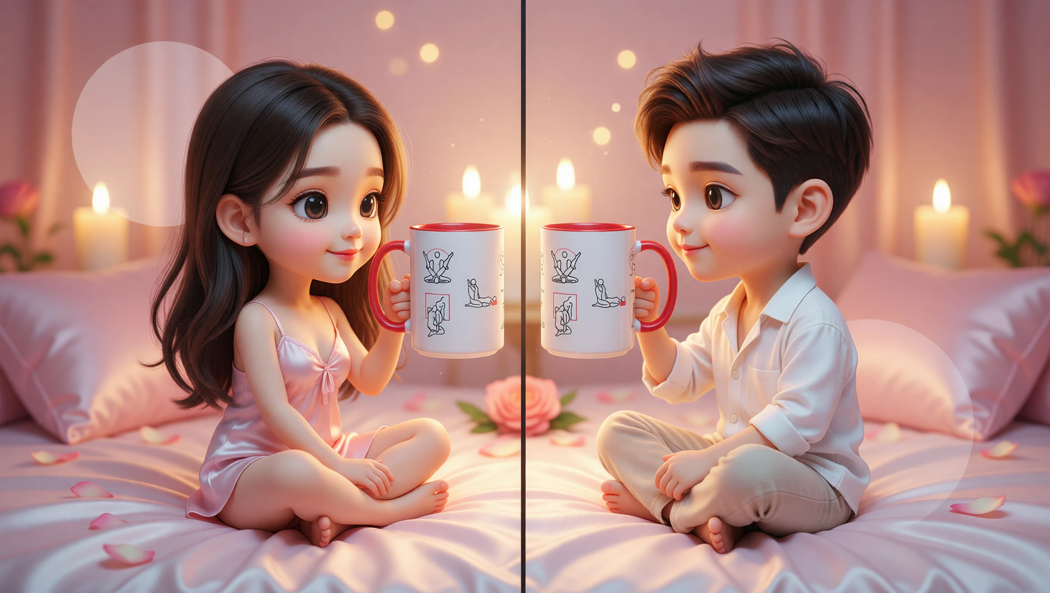 Woman lies back facing the camera, propped on pillows. Man kneels above in mirror pose. Lock eyes deeply. Caress necks, chests, and thighs in slow sync. Breathe together to heighten anticipation. Hands roam freely, teasing erogenous zones.