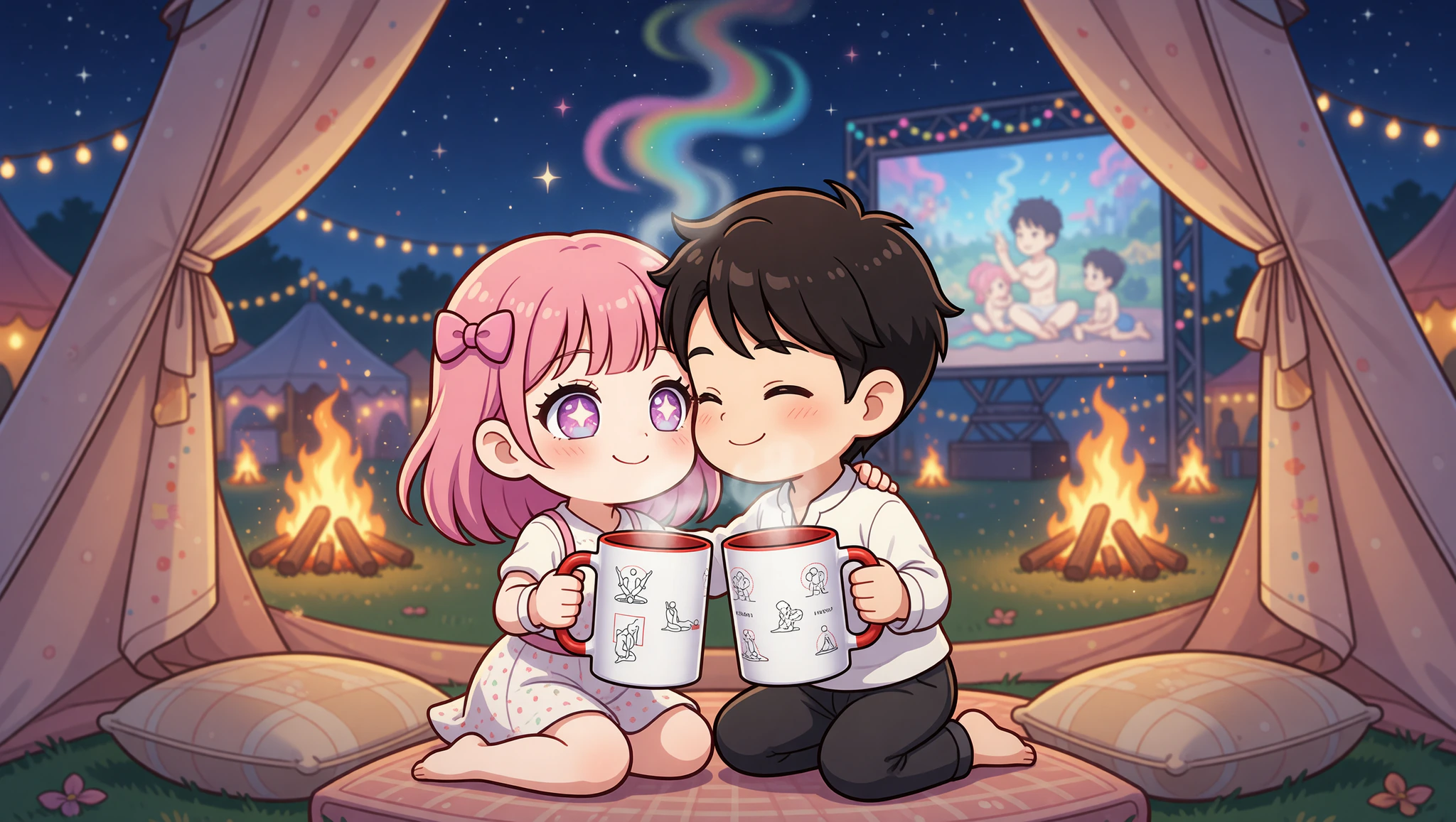 Spread a blanket near the festival screen. She lies back, legs parted. He kneels between, entering slowly missionary style. Thrust in time with the movie's sensual pace. Her hands grip his shoulders. Eyes lock on each other and the screen for double intensity. Build heat with the film's erotic flow.