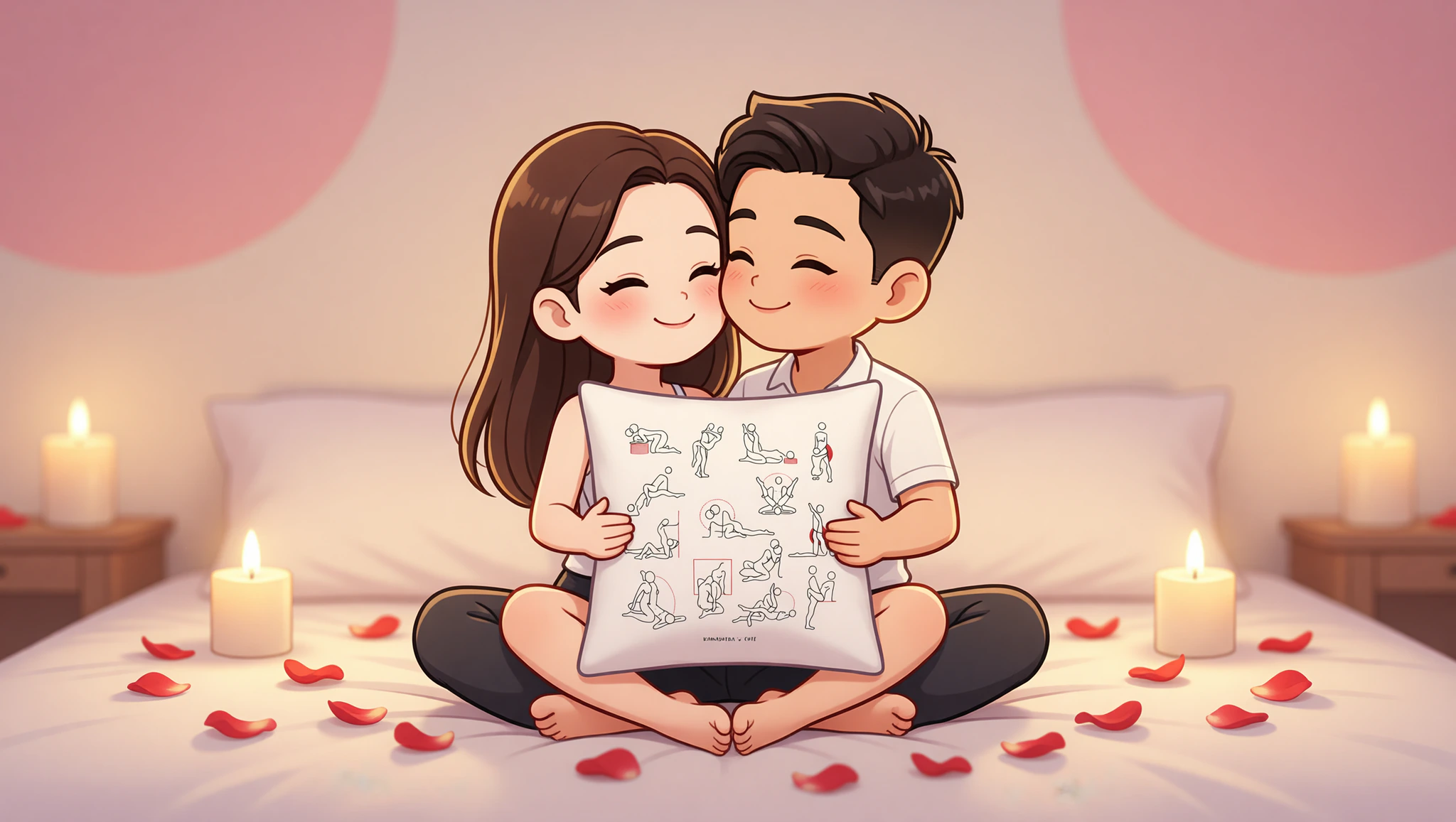 Sit facing each other on the bed, legs crossed. She wraps her legs around his waist while he enters slowly. Rock together in rhythm, hands caressing backs and faces. Maintain eye contact for emotional intensity. Lean back slightly for deeper penetration as passion builds.