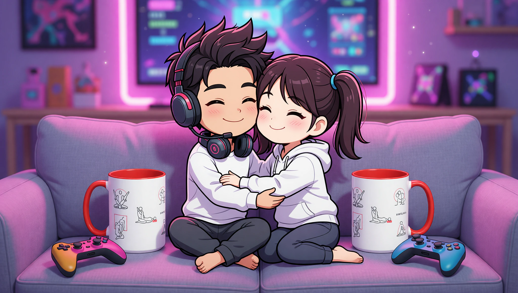 Sit facing each other on the couch, legs wrapped around waists. Hold controllers loosely at first, then set aside. Rock gently in rhythm like syncing game moves. Build speed as arousal grows for mutual thrill.