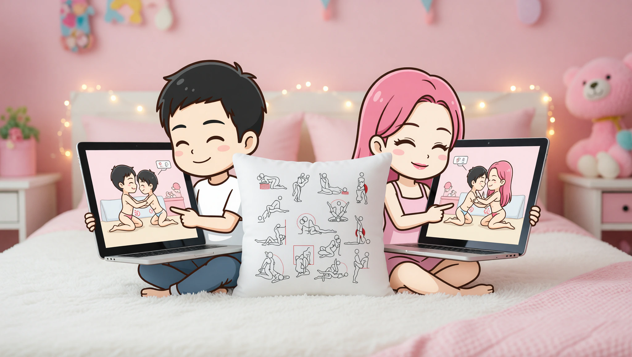 Both lie on your backs facing the camera. Prop phones at eye level for deep eye contact. Slowly stroke yourselves in unison, thrusting hips upward to mimic penetration. Whisper sweet nothings as rhythms build.