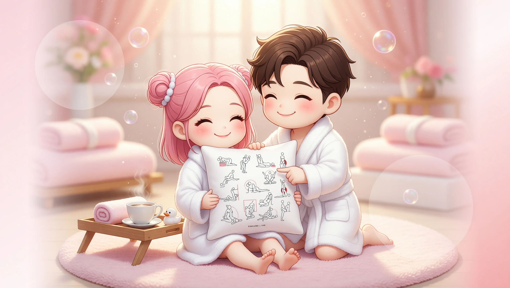 Sit facing each other in the warm tub, knees bent up, soles of feet pressing together. Lean forward until foreheads touch. Place hands on partner's waist or shoulders. Lock eyes, breathe in sync for 10 minutes. Feel the steam heighten every sensation as chests nearly meet.